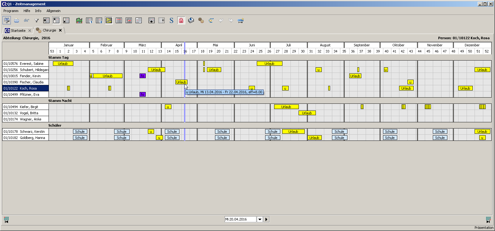 Der Urlaubsplan bietet eine Ganzjahresübersicht. Hier werden die Kalenderwochen eines Jahres abgebildet. Pro Person werden die bereits eingetragenen Fehlzeiträume dargestellt. So erhalten Sie eine gute Übersicht für das gesamte Jahr.