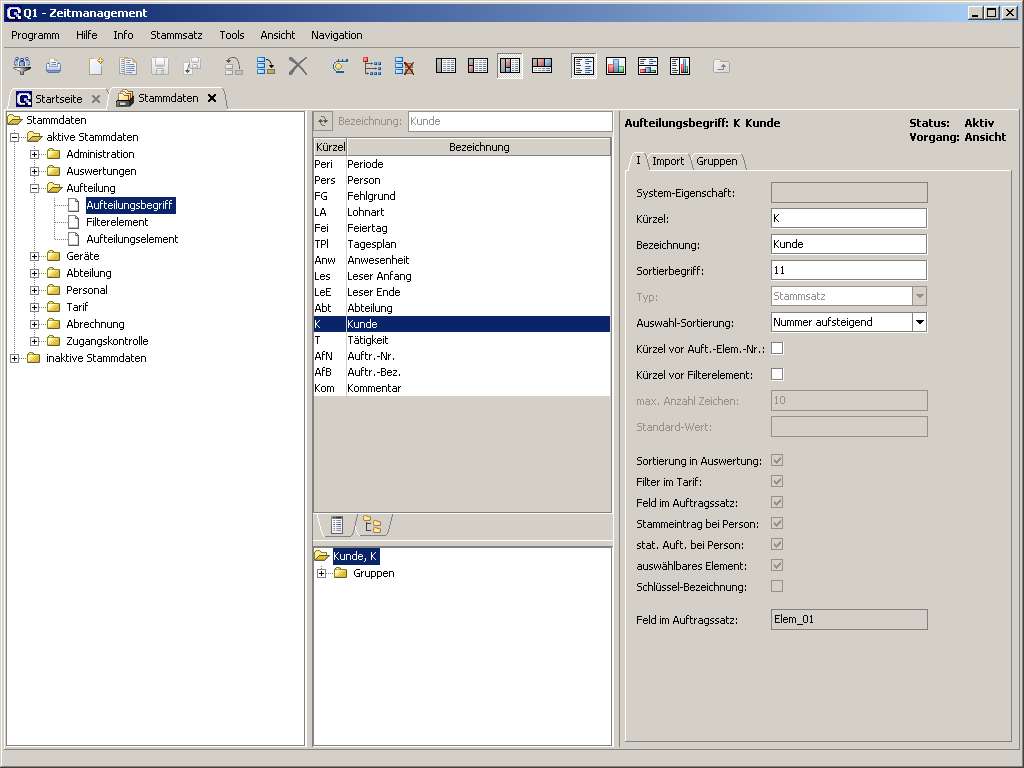 Definieren Sie nach Bedarf Aufteilungsbegriffe, auf die Zeiten verteilt werden sollen. Die Abbildung zeigt ein Beispiel für den Aufteilungsbegriff "Kunde".