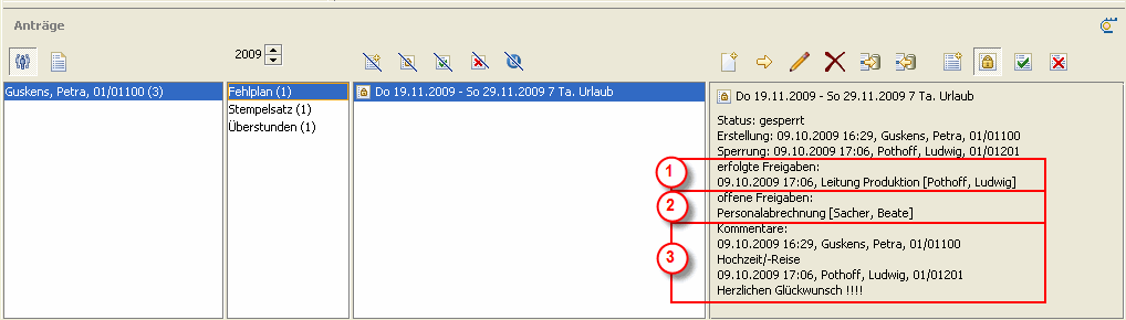 Beispiel Mitarbeiterin Petra Guskens: Ihre Anträge werden hier mit ihrem aktuellen Bearbeitungsstatus gelistet. Die Historie der Änderungen ist für den ausgewählten (hier blau markierten) Antrag im rechten Bereich des Bildschirms dokumentiert. Es handelt sich hier um einen Fehlplan-Antrag: Frau Guskens stellte für den Zeitraum 19.11.2009 bis 29.11.2009 (7 effektive Tage) einen Urlaubsantrag. Zur Zeit befindet sich der Antrag im Status gesperrt, denn ihr Abteilungsleiter hat ihn bereits kurz nach der Antragstellung bearbeitet. Er hat ihn für seinen Teil genehmigt und somit freigegeben (siehe erfolgte Freigaben [1]). Frau Sacher aus der Personalabteilung wird unter offene Freigaben geführt; ihre Zustimmung (z. B. auch Sichtvermerk) muss noch erfolgen, ehe der Urlaub als genehmigt eingetragen wird (siehe [2]). Unter den Kommentaren (siehe [3]) steht zunächst Frau Guskens Begründung für den Urlaubsantrag. Darunter der zweite Kommentar von ihrem Vorgesetzen.